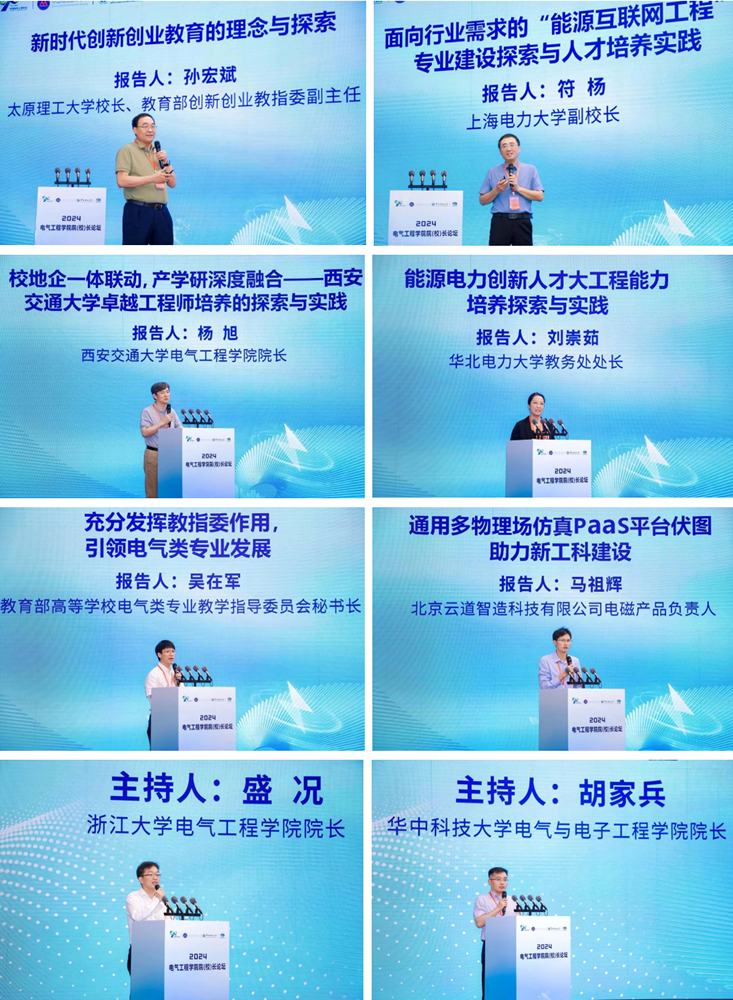 太原理工大学校长、教育部创新创业教指委副主任孙宏斌深入探讨了新时代创新创业教育的理念与探索。上海电力大学副校长符杨介绍了面向行业需求的“能源互联网工程”专业建设探索与人才培养实践。西安交通大学电气工程学院院长杨旭分享了校地企一体联动,产学研深度融合的西安交通大学卓越工程师培养的探索与实践。华北电力大学教务处处长刘崇茹深入探讨了能源电力创新人才大工程能力培养探索与实践。教育部高等学校电气类专业教学指导委员会秘书长吴在军分享了充分发挥教指委作用,引领电气类专业发展的策略。北京云道智造科技有限公司电磁产品负责人马祖辉介绍了通用多物理场仿真PaaS平台伏图助力新工科建设的应用与影响。