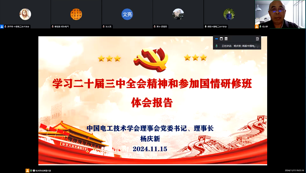 11月15日,中国电工技术学会举办“百名科学家讲党课”报告会。学会理事会党委书记、理事长杨庆新以“学习党的二十届三中全会精神和参加全国学会党组织负责人国情研修班体会”为主题作辅导报告。学会党委委员、党支部书记、秘书长韩毅主持报告会。