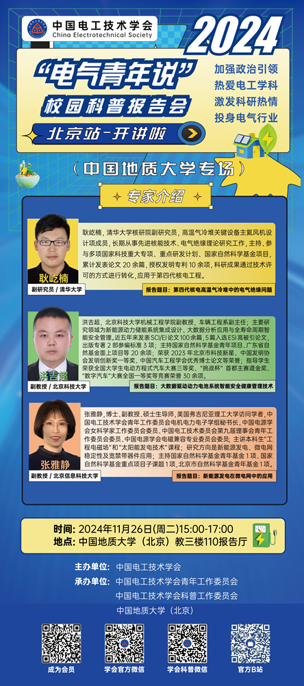 2024年“电气青年说”第五场校园科普报告会·北京站中国地质大学专场将于11月26日在中国地质大学(北京)教三楼110报告厅举办,精彩内容,敬请期待。