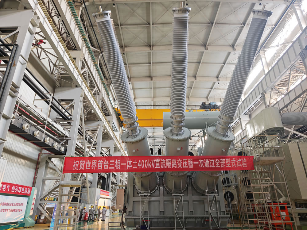 (4)ZSG-3000/10.5-400三相一体±400kV直流隔离变压器服务于国家重大项目“聚变堆主机关键系统综合研究设施(CRAFT)”,是世界首台±400kV三相一体交直流隔离变压器。实现了对交流配电10kV与直流侧±400kV高电位的有效隔离,保证了变压器具备高电压交流耐受能力、直流耐压能力,解决了交直流隔离变压器主纵绝缘设计、漏磁控制、复杂绝缘结构的自冷温升控制等一系列技术难题,同时解决了三相一体±400kV阀侧出线套管的空间布置及阀侧出线装置的自主研制等技术难题。