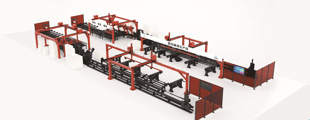 (20)输变电角钢塔柔性智能双线协同制造装备采用双智能角钢生产线“面对面”并行布置设计,集中上下料区便于物料流转,集成控制,一人即可完成双线操控。依靠自主开发的角钢塔柔性智能制造系统,融合视觉识别自动拆垛上料、数控冲孔、参数化双端激光切角、根据后工序自动下料分类码垛等多项先进技术,实现了角钢加工双线并行智能生产,一键式换产。大幅降低设备占用场地面积和人工成本;在优化部分工艺基础上,结合套料算法有效提升材料利用率,增加了产品附加值;有力推动角钢塔制造智能化、绿色化发展。
