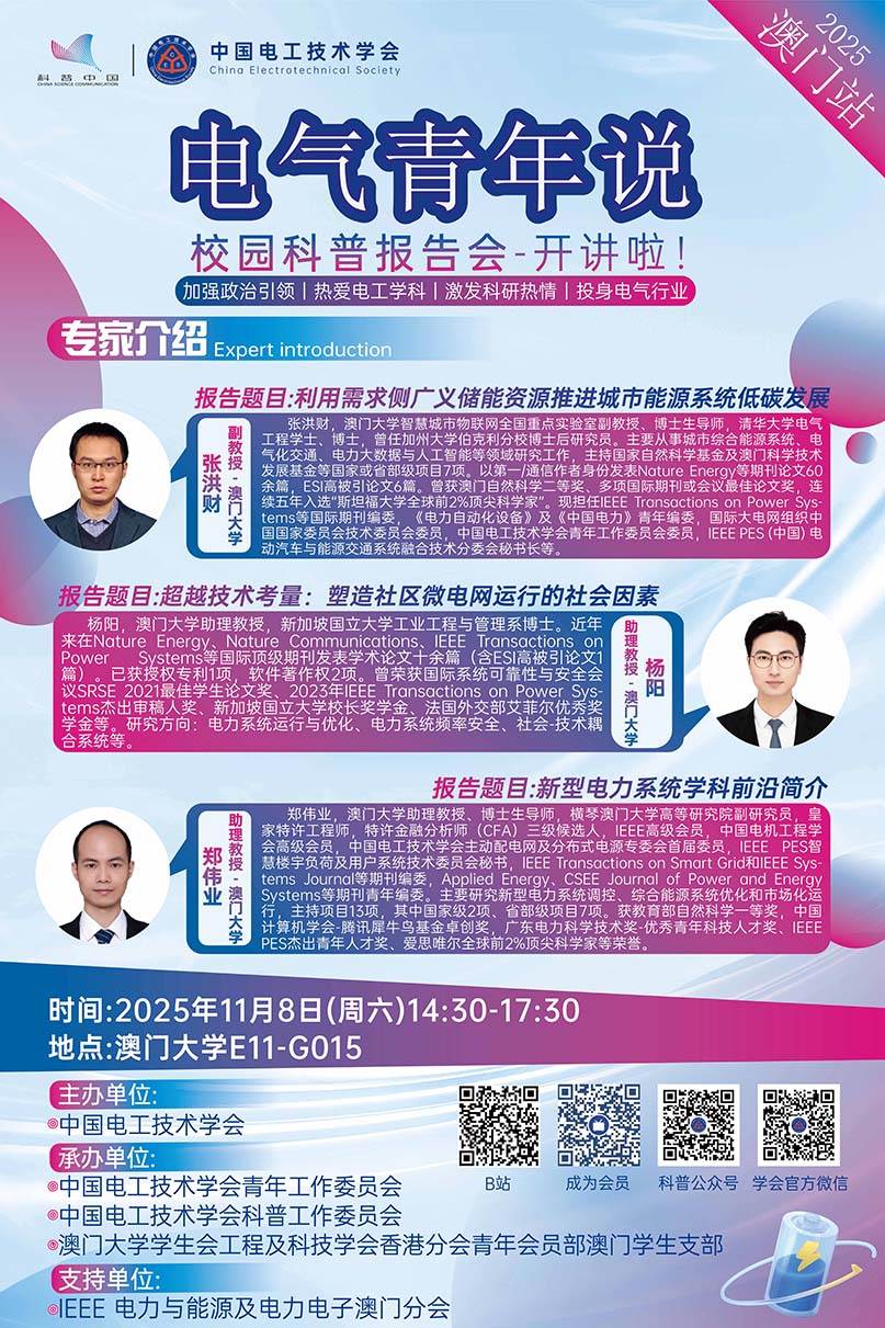 “电气青年说”第五场校园科普报告会——澳门大学专场,将于2025年11月8日在澳门大学E11-G015举办。本场活动是由澳门大学张洪财副教授担任召集人,学会青年工作委员会、科普工作委员会和澳门大学学生会工程及科技学会香港分会青年会员部澳门学生支部承办,IEEE电力与能源及电力电子澳门分会作为支持单位提供宝贵支持。