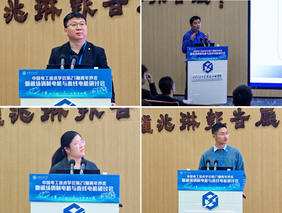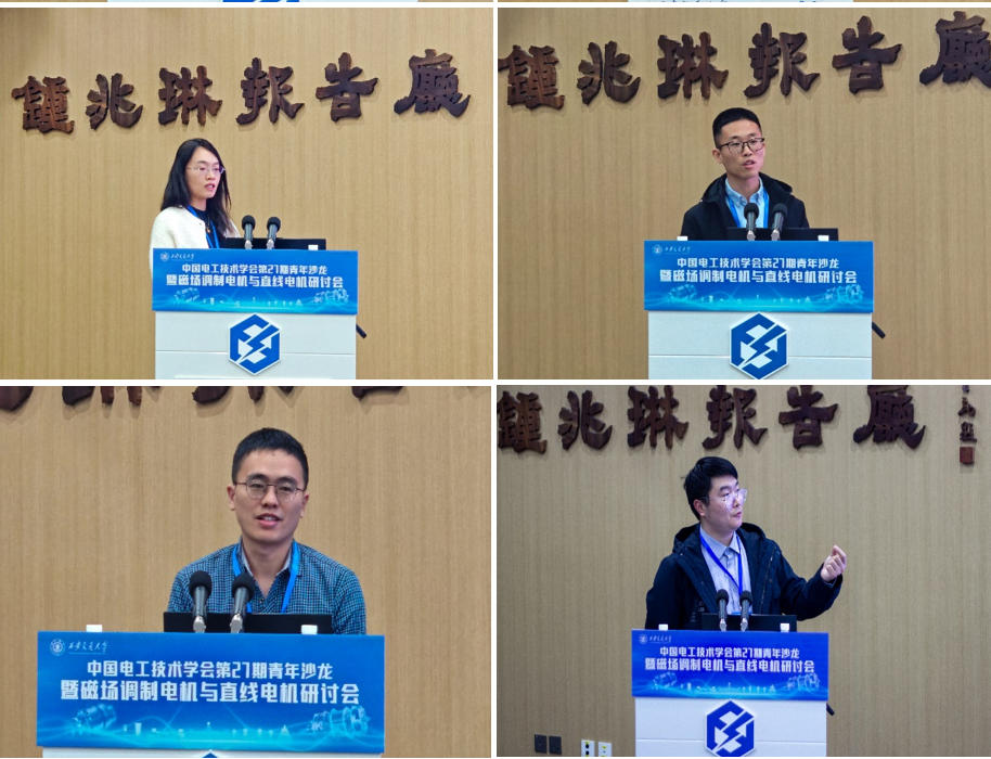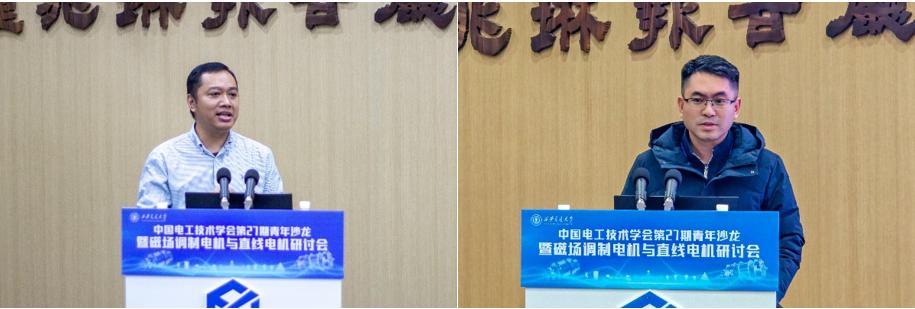 在学术报告环节,哈尔滨工业大学白金刚教授、南京理工大学耿伟伟副教授、郑州轻工业大学刘小梅讲师分别就圆筒型直线电机系统、高功率密度轴向磁通永磁电机、复合初级永磁同步直线电机推力波动抑制等关键技术分享了最新研究进展。来自华中科技大学、山东科技大学、四川大学、江苏大学及西安交通大学的青年学者周游助理研究员、陈红讲师、王学庆副研究员、徐亮副教授、梁阳助理教授,依次报告了各自在增材制造应用、高转矩密度磁场调制电机设计、多功率通道控制、谐波损耗抑制、高速电机控制等方向的研究成果。