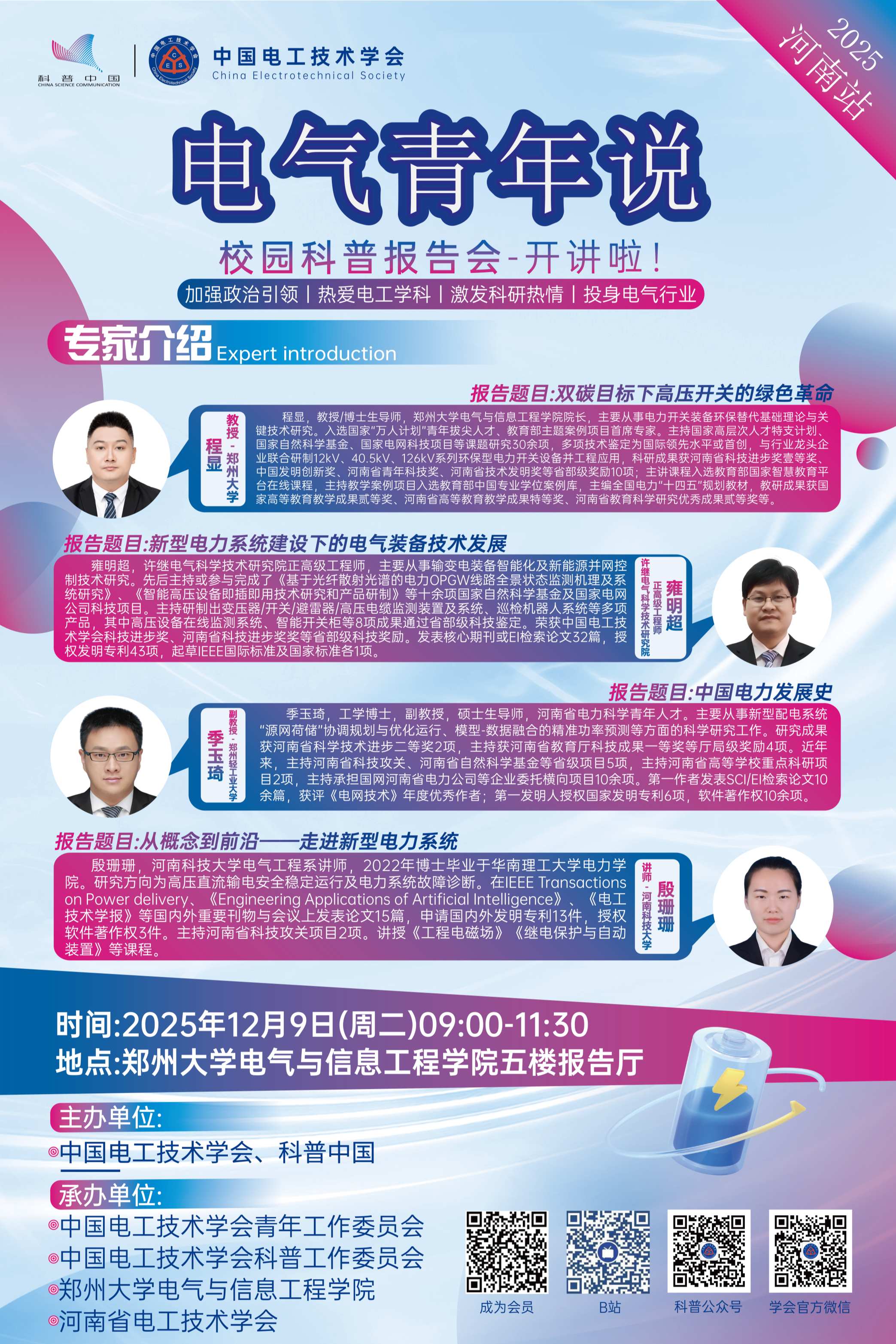 2025年12月9日,与您相聚郑州大学。欢迎电气工程相关专业的师生、科研技术人员以及所有关注电气技术发展的社会各界人士踊跃参与!